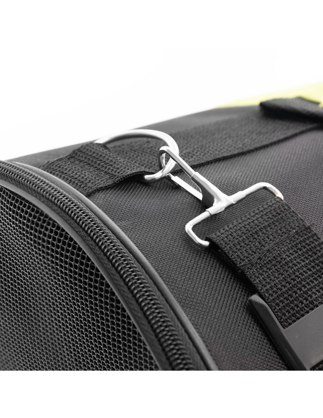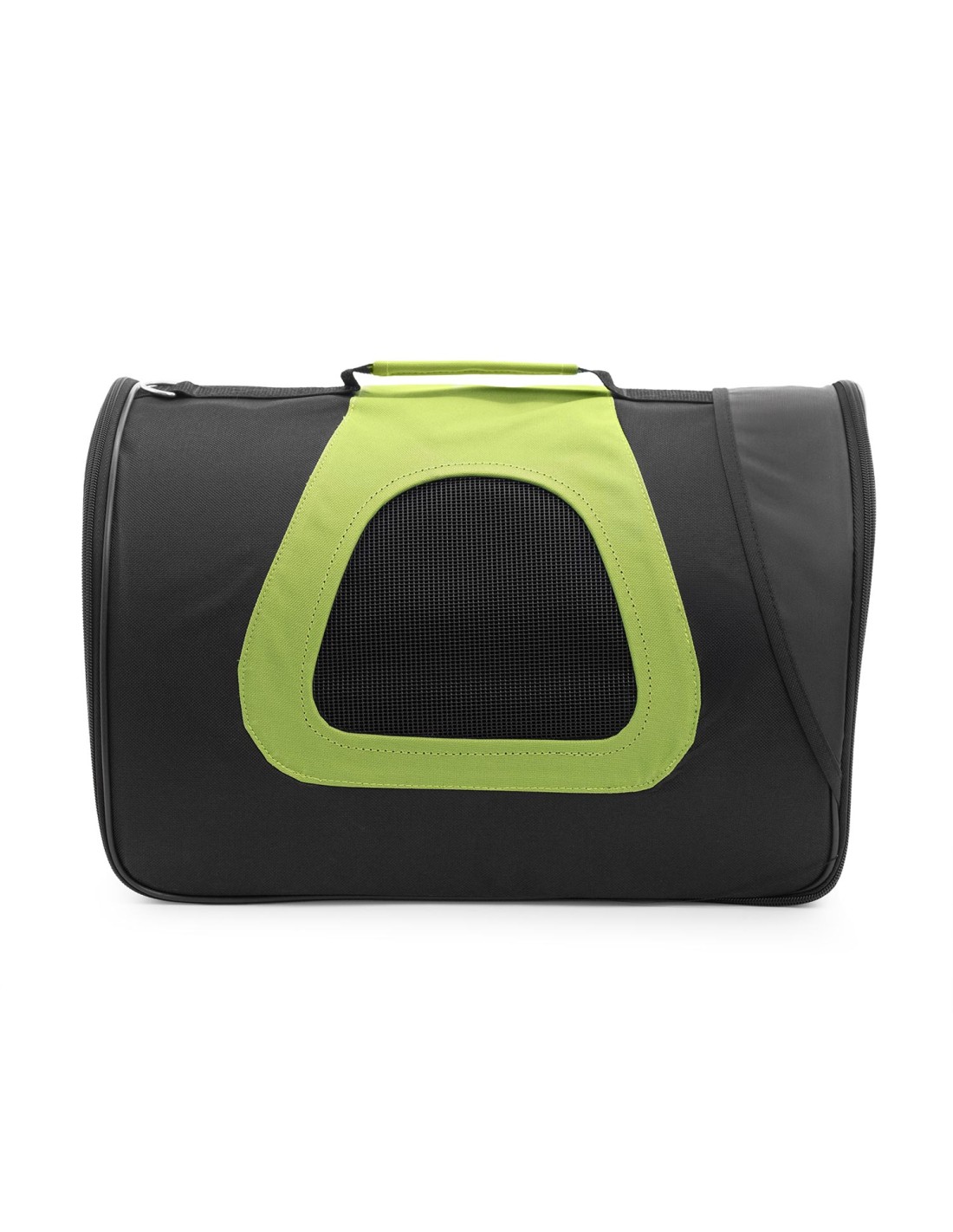 Bicolor pet carrier, for transporting dogs and cats. With high quality nylon, shoulder strap and handle. Available in different sizes and mixed colors.