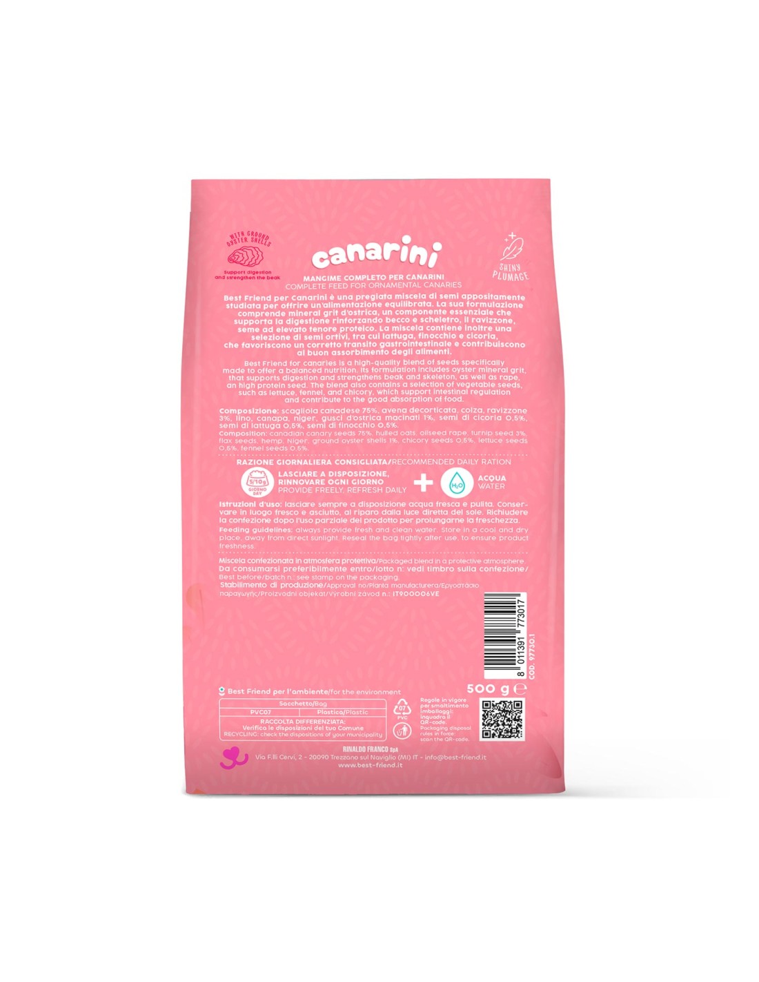 Best Friend complete feed for canaries is a high-quality, preservative-free, 100% natural seed mix specially designed to provide a balanced diet. Its formulation includes mineral oyster grit, an essential component that supports digestion by strengthening the beak and skeleton; rape, a high-protein seed with nutritional and dietary properties, contributes to the growth and maintenance of vitality in your canaries. In addition, the mix contains a selection of vegetable seeds, including lettuce, fennel and chicory, which promote proper gastrointestinal transit and contribute to good food absorption. Pack of 500 g