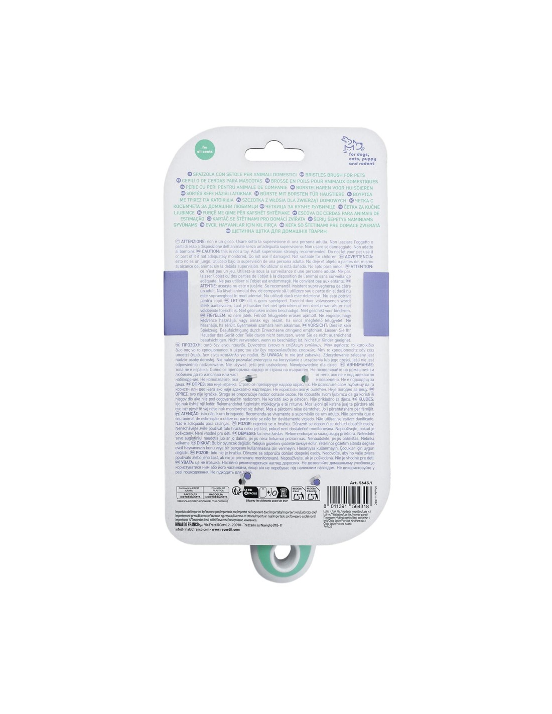Brush with bristles that smooths and polishes the coat while keeping it soft; useful for removing surface dirt such as dust and dirt. Helps distribute lotions and perfumes throughout the coat. Available in different sizes suitable for all dogs, cats and rodents and for all hair types.