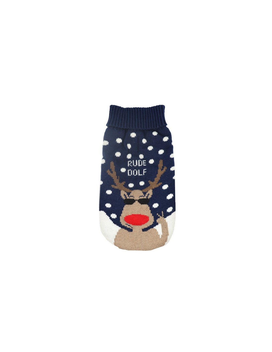 Sweater for dogs Rude Dolf, typical Christmas, with blue background, white pois, the funny image of a reindeer with sunglasses and the words "Rude Dolf". Soft and warm, with turtleneck,...