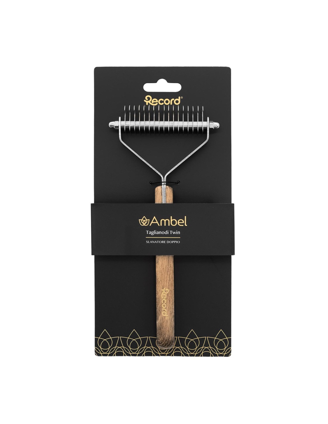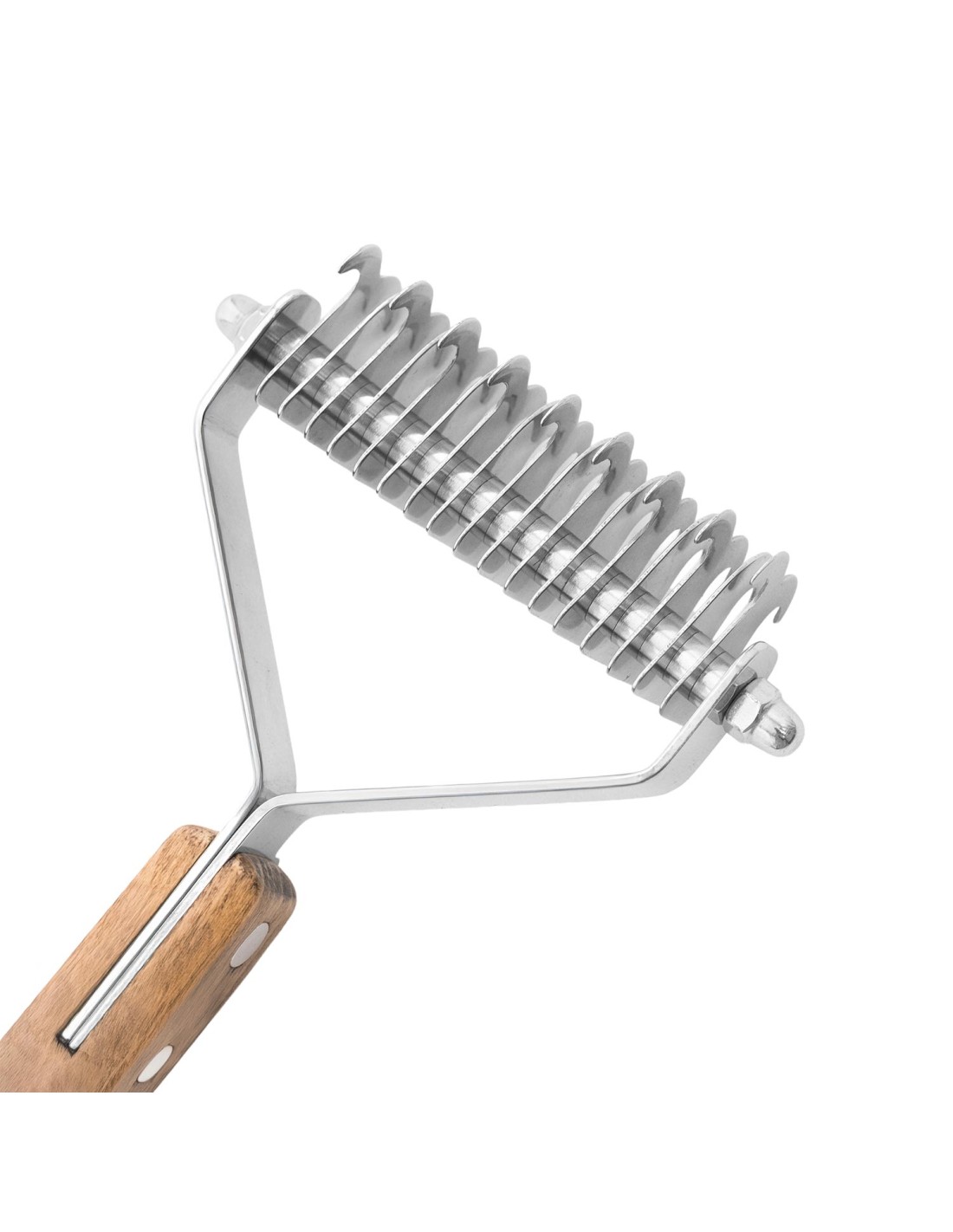 The Twin dematting is a very useful tool for removing excess hair from coats during the bathing phase. Its characteristic double head with narrower and wider teeth allows two specific passes over the coat to thoroughly clean the dead hair: the first pass with wide teeth unravels the hair and starts to open it up, while the second, after the work of the first, removes the dead hair.