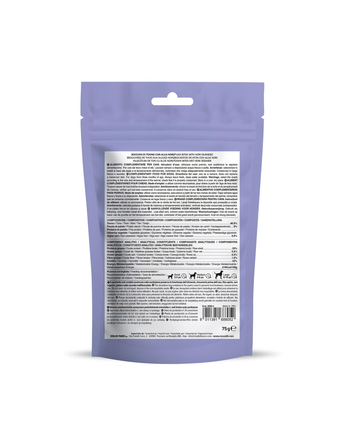 ProIn single or double animal protein dog snacks are made with high biological value proteins from premium meats such as duck, chicken, tuna, cod, rabbit and lamb. These highly digestible protein sources support the development and maintenance of strong, healthy muscles, while also promoting recovery after physical activity. The recipe is rounded off with a selection of superfoods such as blueberries, spinach, apple, salmon and chia seeds, foods naturally rich in antioxidants, vitamins and fibre, which strengthen the immune system and promote general well-being. Energy is provided by slow-release carbohydrates, such as sweet potato and potato starch, as well as nutrients from fruit, vegetables and superfoods such as goji berries. These ingredients ensure constant, balanced energy, reduce hunger and counteract blood sugar spikes. Healthy fats such as fish oil and chia seeds complete the formula with an excellent calorie intake and a prolonged satiating effect, thanks to their ability to retain fluids and release energy over time. Thanks to these characteristics, ProIN snacks improve the performance of active or sporting dogs, providing immediate energy and important nutritional support, supplementing essential vitamins and minerals and promoting intestinal health thanks to the balance between natural fibres and highly digestible proteins. The quality of the ingredients and the absence of artificial additives ensure purity and safety, while the grain-free and gluten-free formula makes them suitable even for the most sensitive dogs. Each snack is the result of a controlled, slow and careful production process, which guarantees high quality standards and an irresistible taste for your dog.