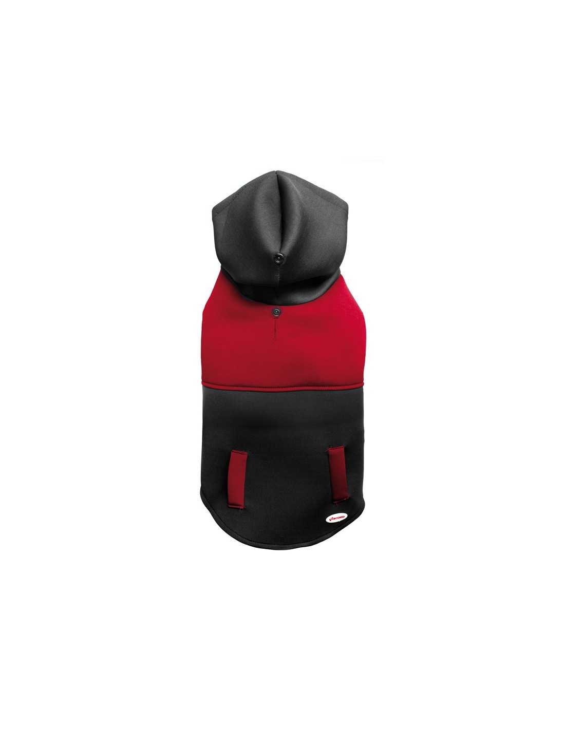 Jogger hooded dog sweatshirt with elasticated leg belt, hood-hook button and leash hole. Lighter than a coat and sportier than a jumper, it is comfortable and practical to wear thanks to the adjustable Velcro fastener. Available in different sizes and in assorted colour combinations (Black/Red and Black/Blue)