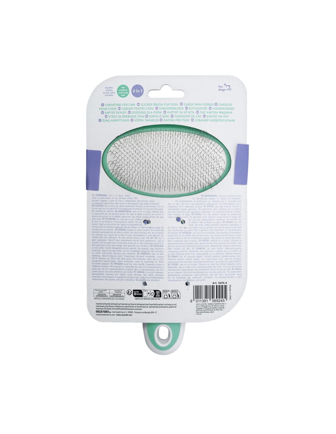 Double slicker brush with non-slip, ergonomic handle: the carder side untangles knots and cleans the coat in depth by removing dirt and dead hair, while the bristle side polishes and smoothes the coat and removes more superficial dirt (dust, dirt, etc.). Ideal for medium and large dogs. Size 11.5 x 19 cm