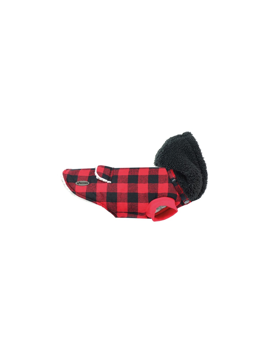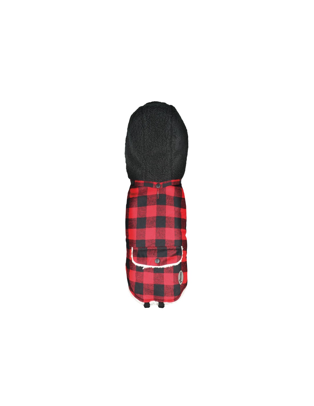 Cappottino per cani a quadri rosso e nero. Dotato di cappuccio removibile e imbottitura a effetto teddy, bottone ferma-cappucio, foro per guinzaglio, chiusura in velcro a strappo ed elastici regolabili per zampe posteriori. Disponibile in diverse misure.