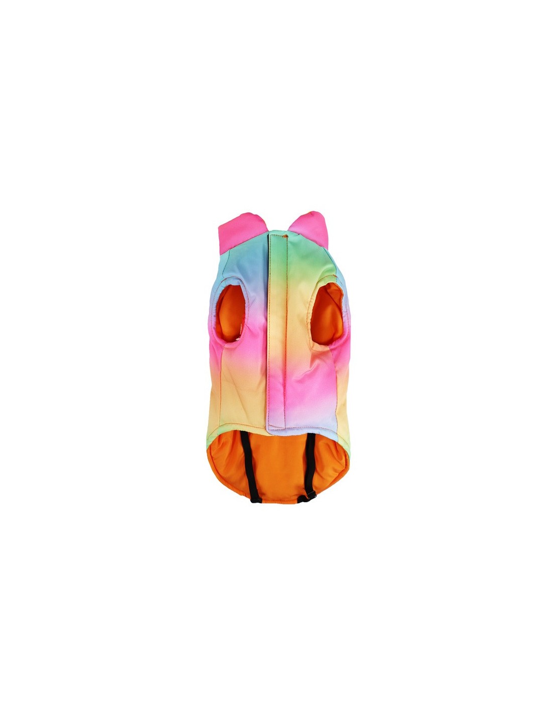 Cappottino impermeabile per cani Rainbow, con fantasia arcobaleno brillante e vivace. Con foro per guinzaglio, chiusura con velcro ed elastici regolabili per le zampe posteriori. Disponibile in diverse misure.