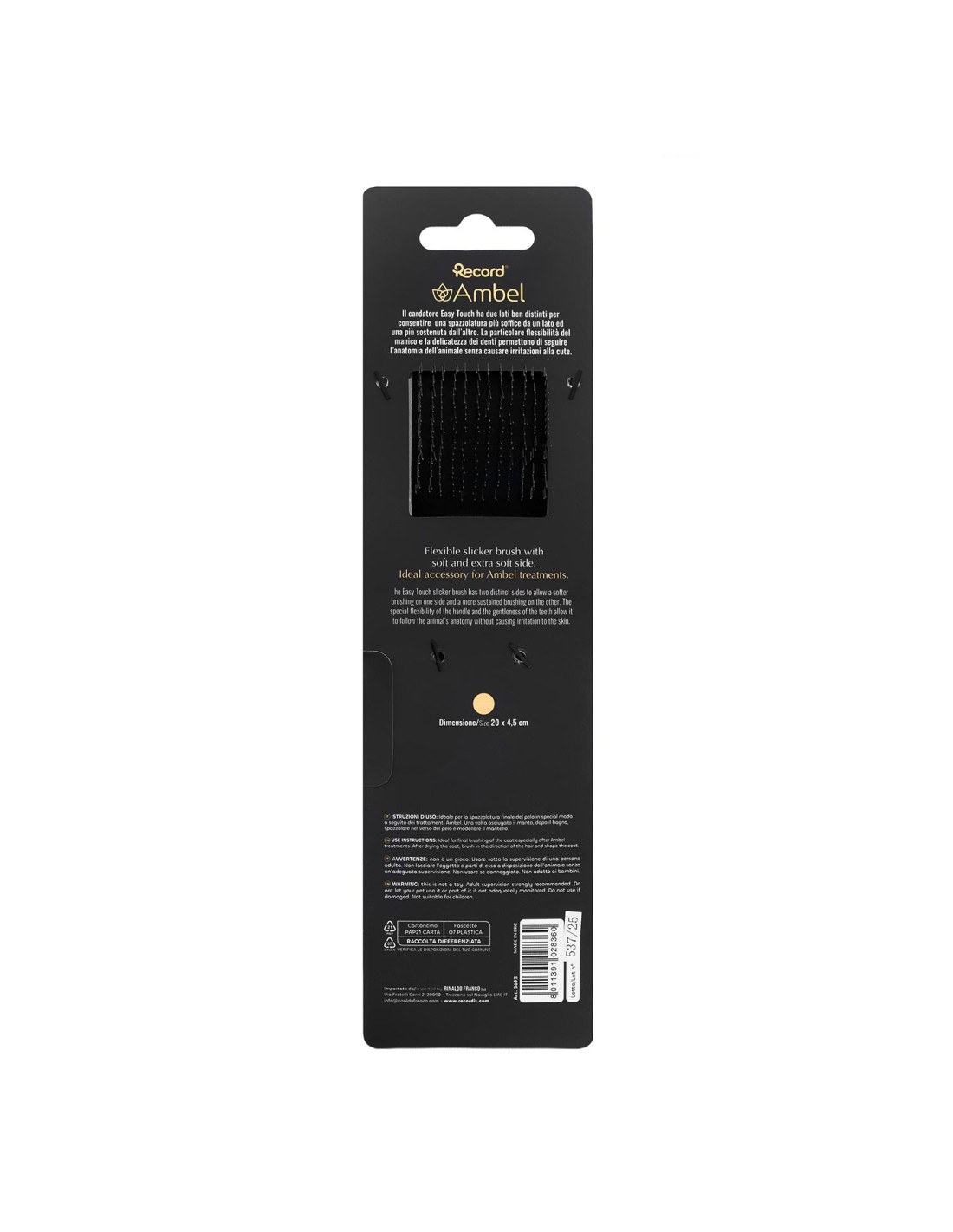 Il cardatore Easy Touch è progettato per offrire una spazzolatura efficace e confortevole in ogni situazione. Grazie ai suoi due lati ben distinti, permette di scegliere tra una spazzolatura più soffice, ideale per la rifinitura e le zone sensibili, e una più sostenuta, perfetta per rimuovere il pelo in eccesso e districare il mantello. La particolare flessibilità del manico consente di seguire in modo naturale l’anatomia dell’animale, mentre i denti delicati rispettano la cute senza provocare irritazioni o fastidi. Ideale per l’uso quotidiano, il cardatore Easy Touch rende la toelettatura un momento piacevole, aiutando a mantenere il mantello sano, ordinato e luminoso. Disponibile in diverse misure.