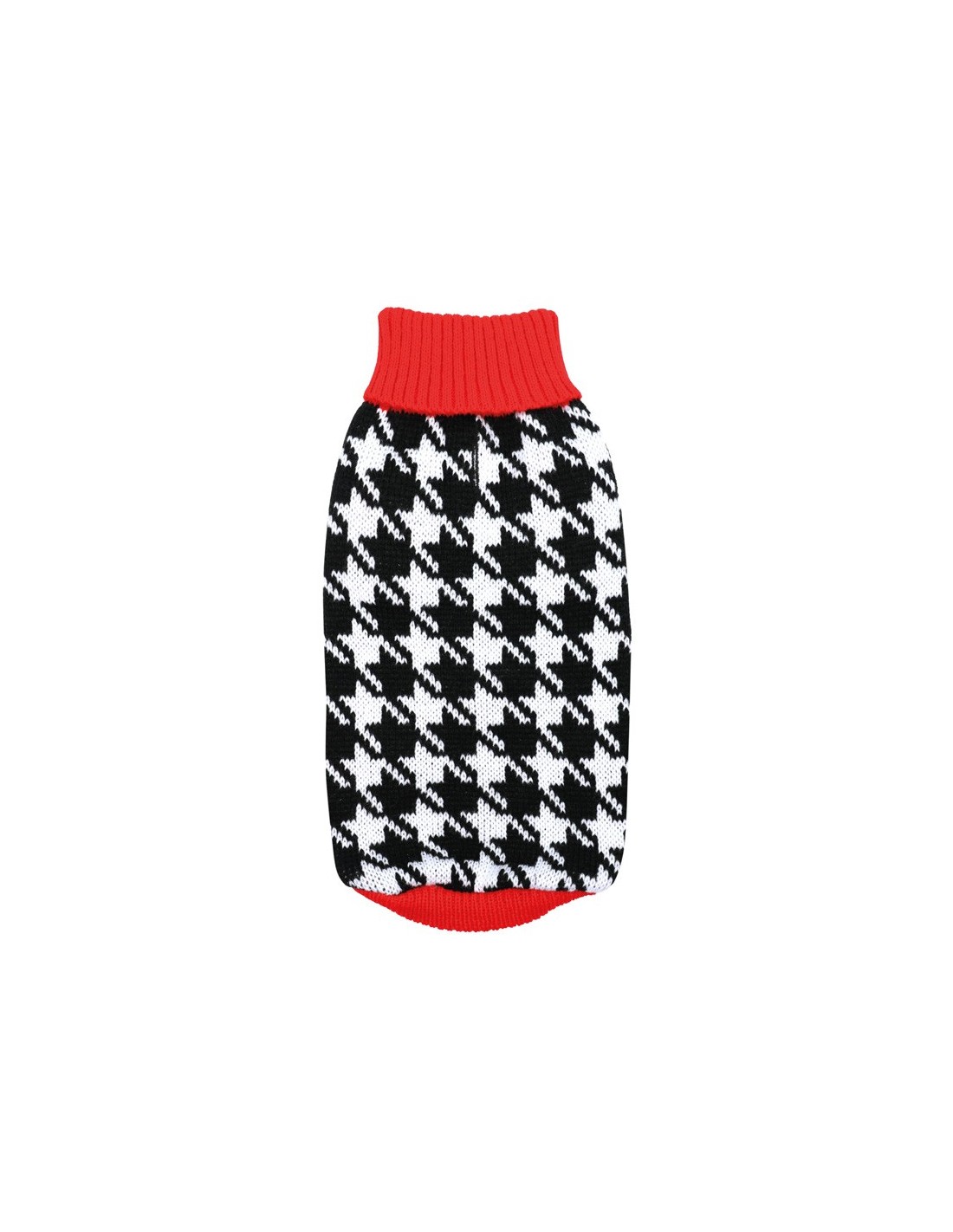 Maglioncino per cani Shopping, con collo alto dolcevita, con fantasia bianco-nera e dettagli rossi. Dotato di foro per il guinzaglio e passante in maglia per le zampe posteriori. Realizzato a maglia con filati caldi e morbidi. Lavabile comodamente in lavatrice a 30*C. Disponibile in diversi colori e misure.