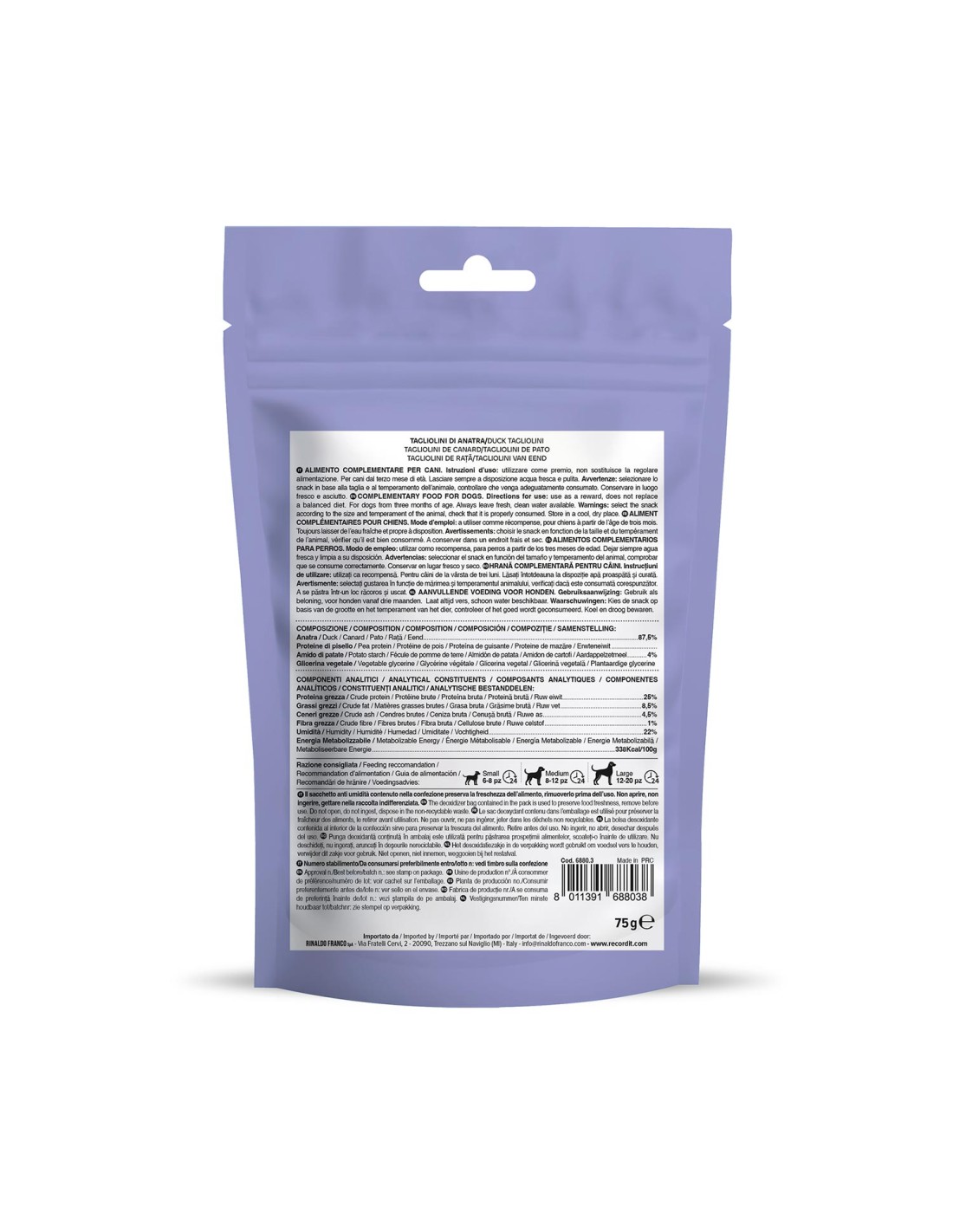 Ingredienti variante 6880.1: Anatra 61%, farina di frumento 15%, fecola di patate 12%, proteine vegetali 5%, farina di spinaci 3%, glicerina vegetale 2%, sorbitolo 2%.